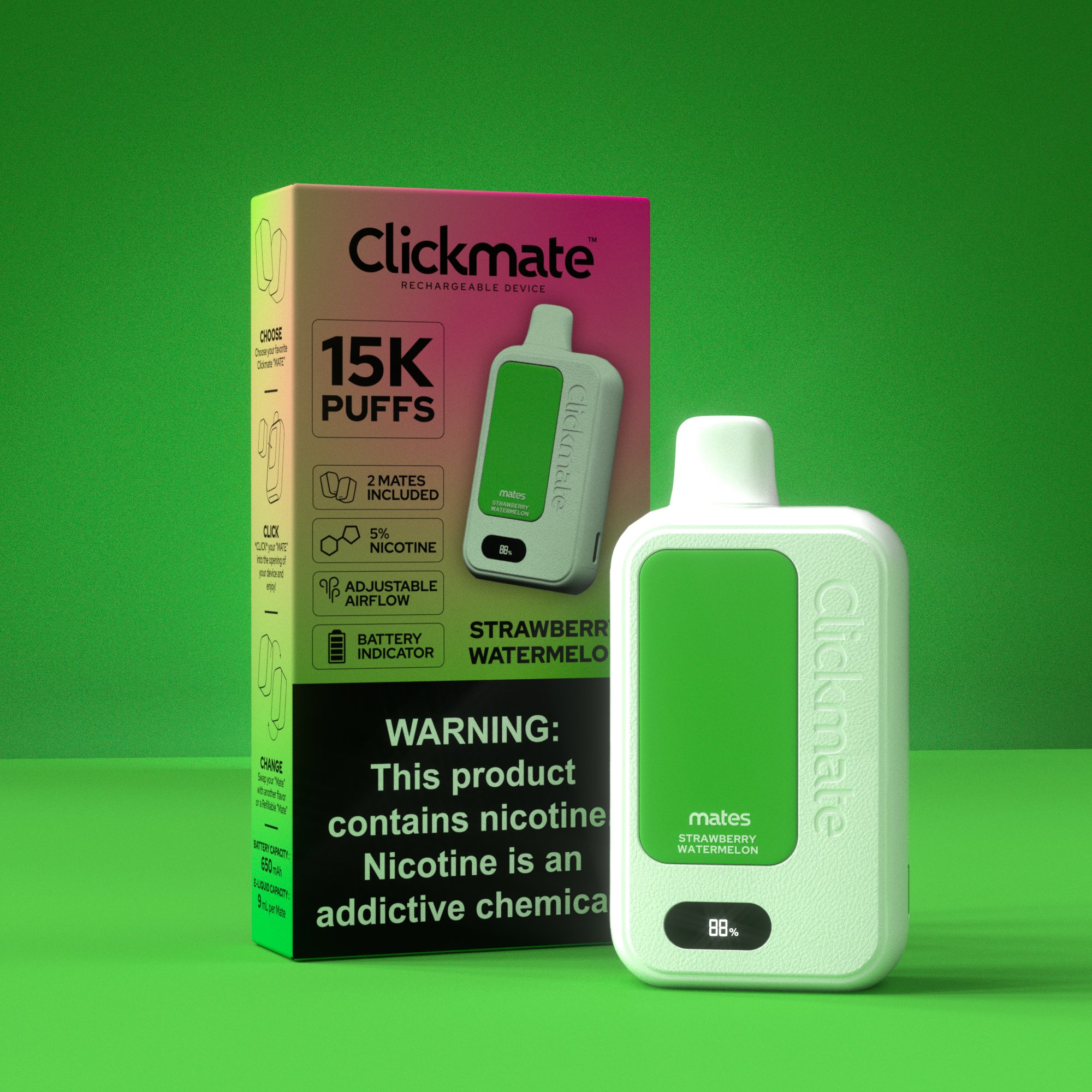 Mates Brand is a nicotine-alternative company created to help people switch to better options than smoking. As Project Lead and Designer, I led every aspect of the brand — from concept and product development to visual identity, packaging, and launch strategy. The lineup includes ClickMate (eco-friendly pod system), LiqMate (e-liquids), PouchMates (nicotine pouches), and MintMates (nicotine mints). With over 30 bold flavors and a cohesive design system, Mates Brand generated over $8 million in revenue.